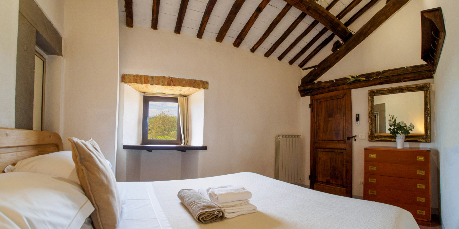 Situato al secondo piano dell’antico monastero, l’appartamento si trova nel luogo un tempo occupato dalla chiesa, le cui vestigia, una capriata di legno e un rosone, sono state conservate intatte. Due antiche finestre ad arco si affacciano sul complesso e sulla valle in corrispondenza del soggiorno con angolo cottura.